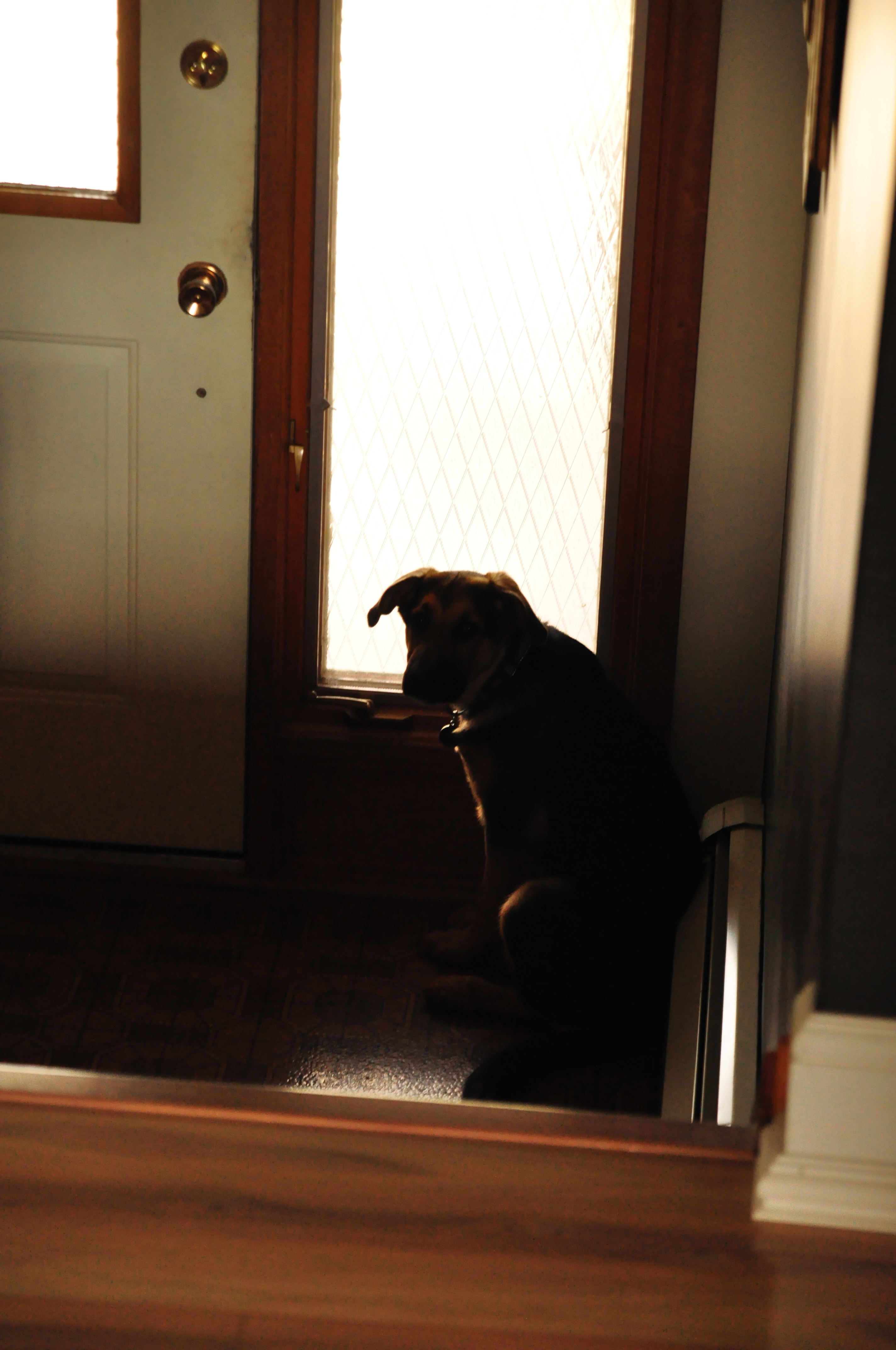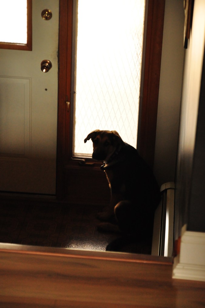 He’s sitting at the front door trying to see if they are outside. You can’t actually “see” through this glass, but you get an idea of shapes, and this pup is looking for a big blob and slightly smaller blob. On Day 1 – he spent the day running from door to door, whining to be let out. It’s like he thought he lost track of the boys and was convinced that “they must be out back, no? Oh, well, let’s go check again out front! No?!? I must have just missed them.” I think you get the idea.