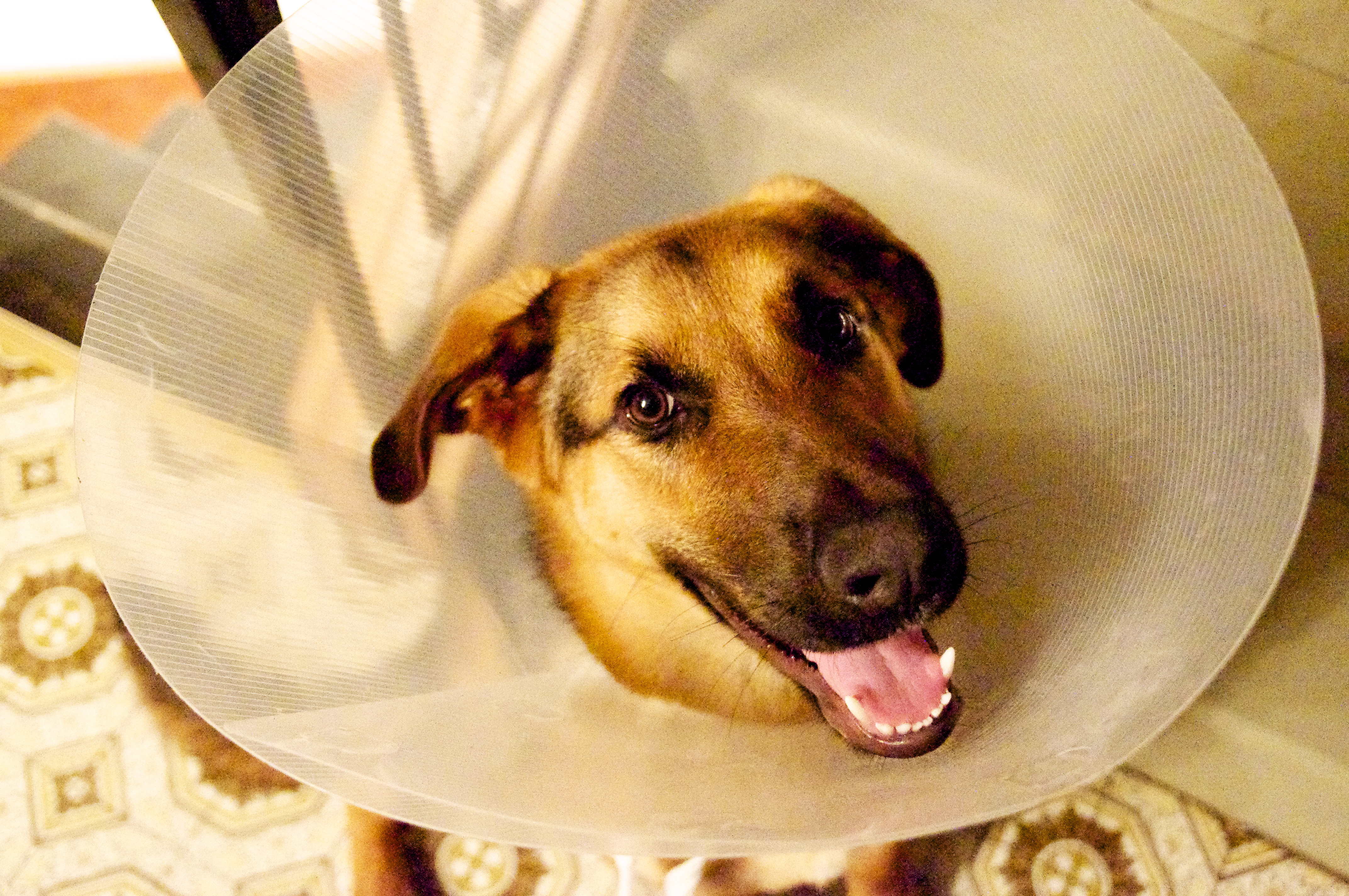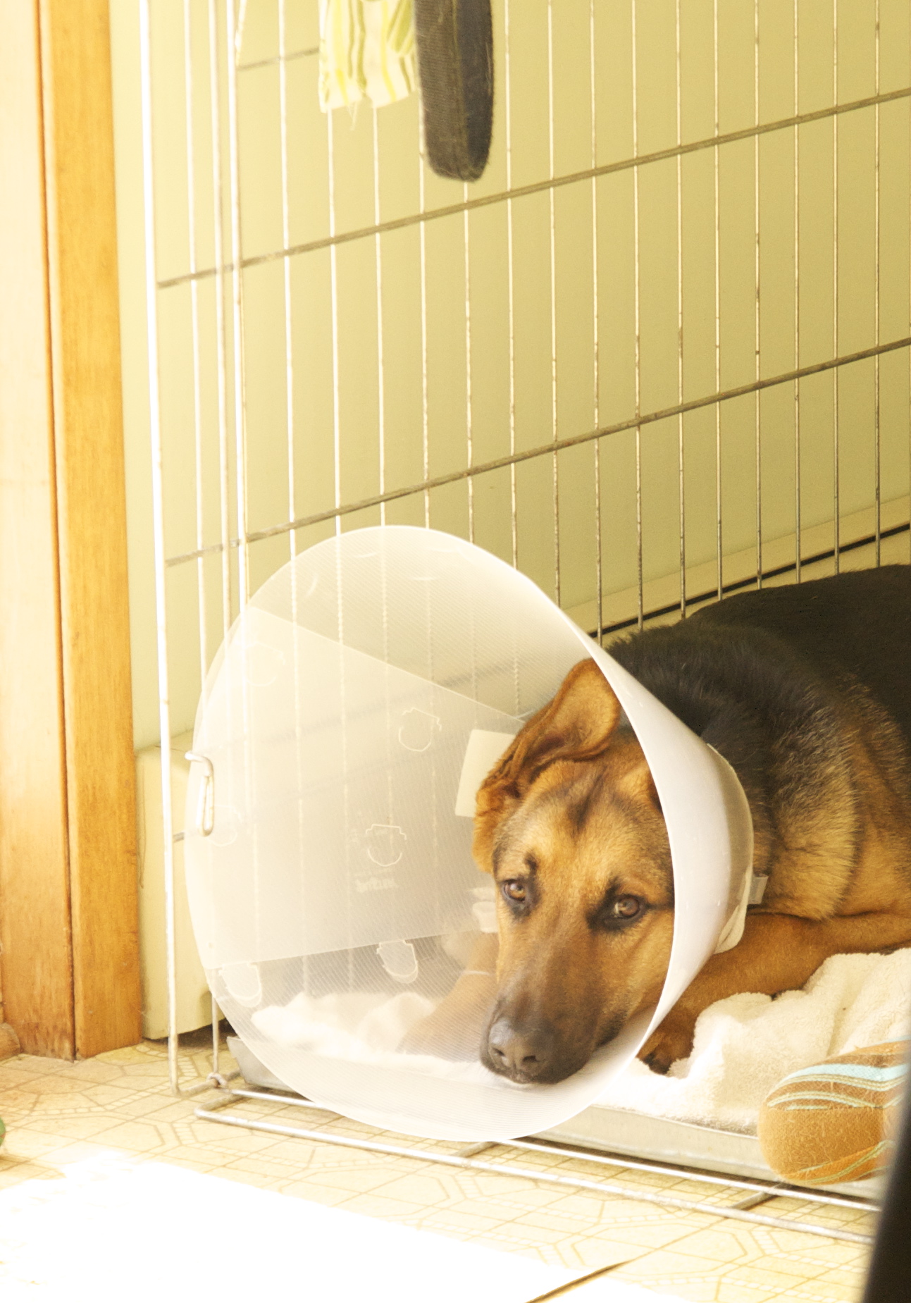 It takes myself, a veterinarian and the assistant to get the cone on his head. Not. Happy. Roman knows cones are SOOO last season. The assistant helps me get him in the back of my truck. “Roman should only have short walks on leas for the next seven days. Running, jumping and access to stairs should be avoided.”