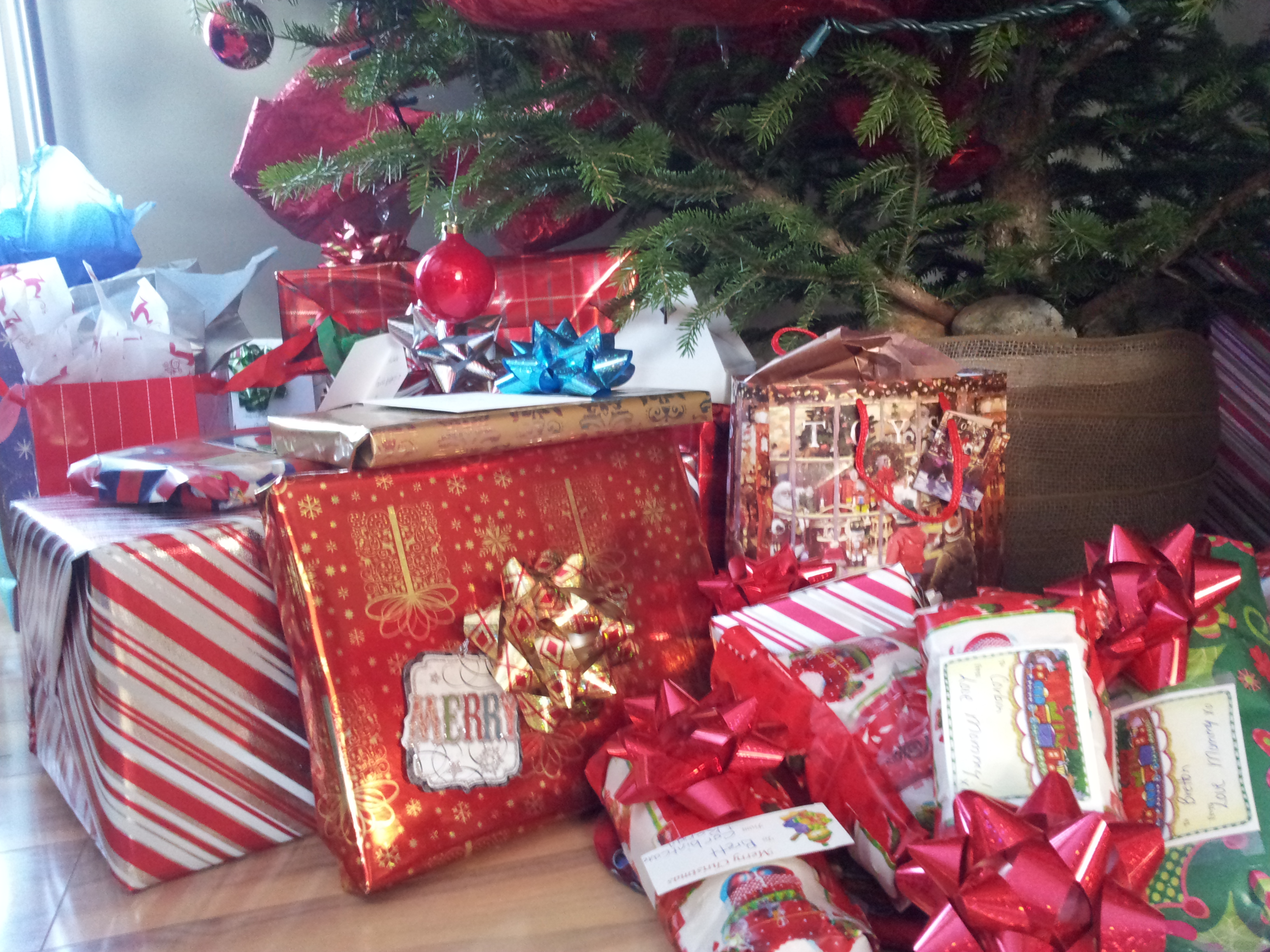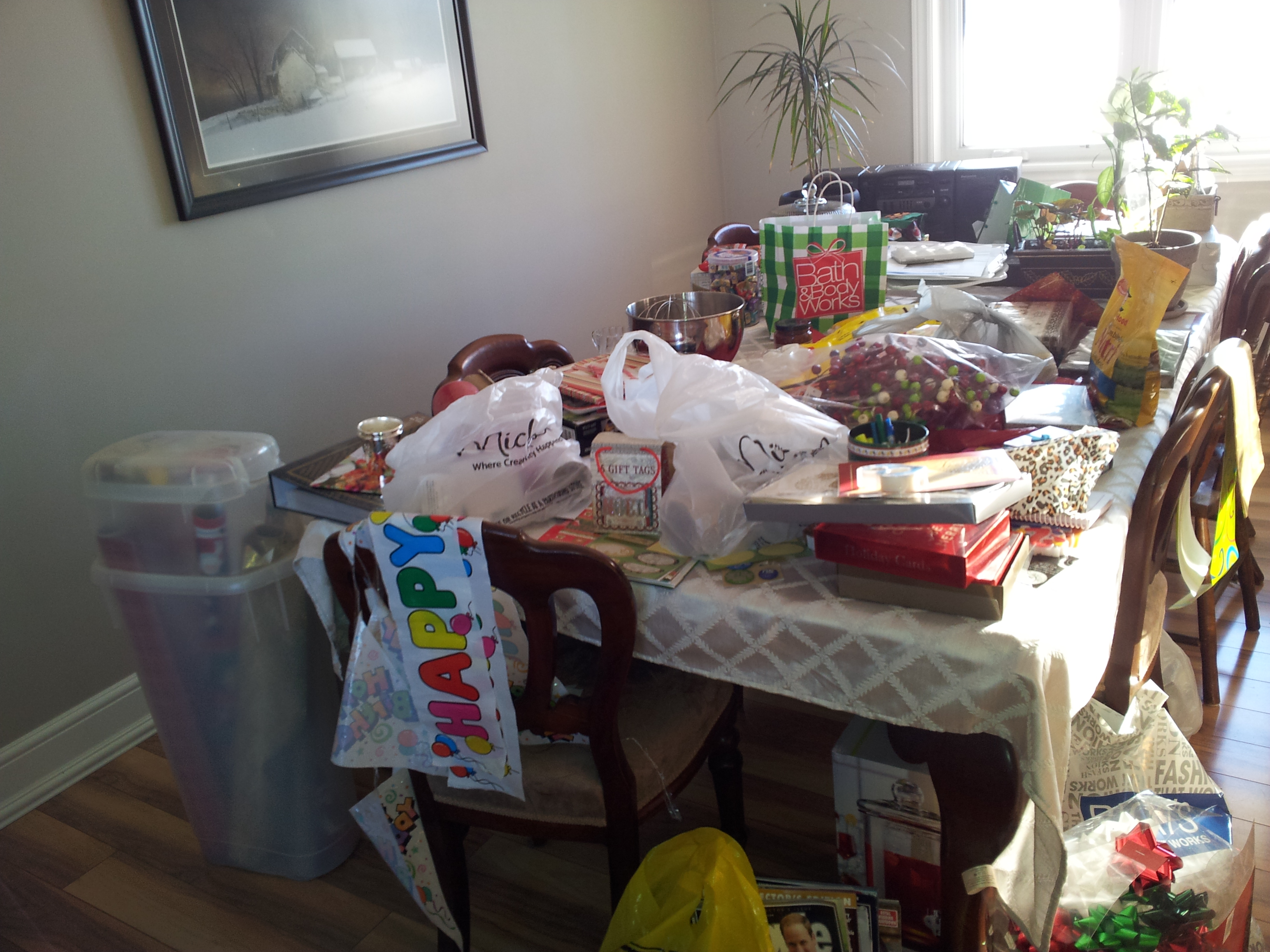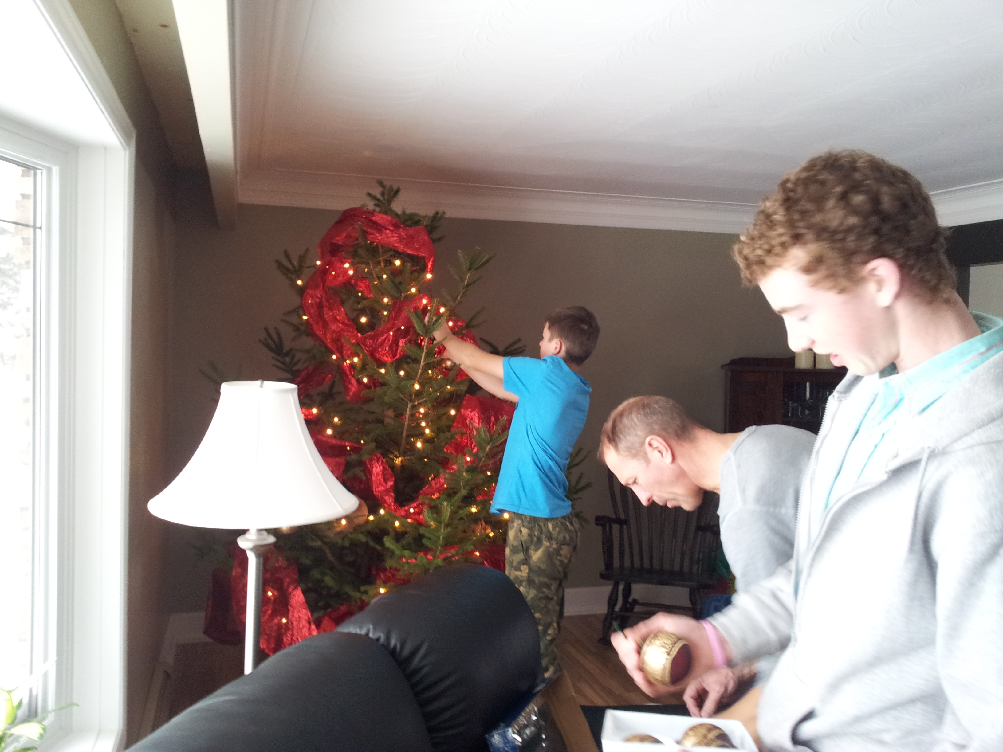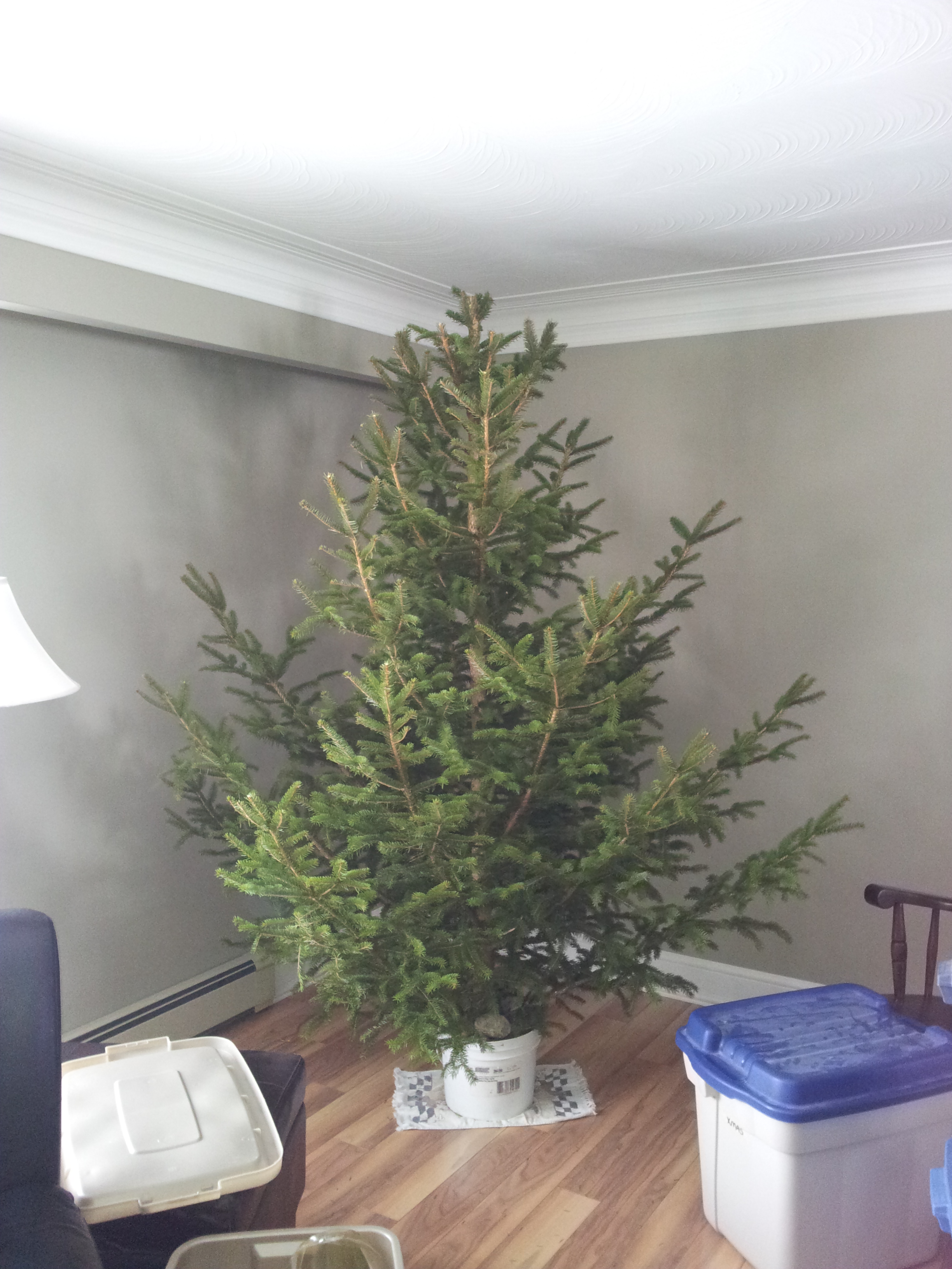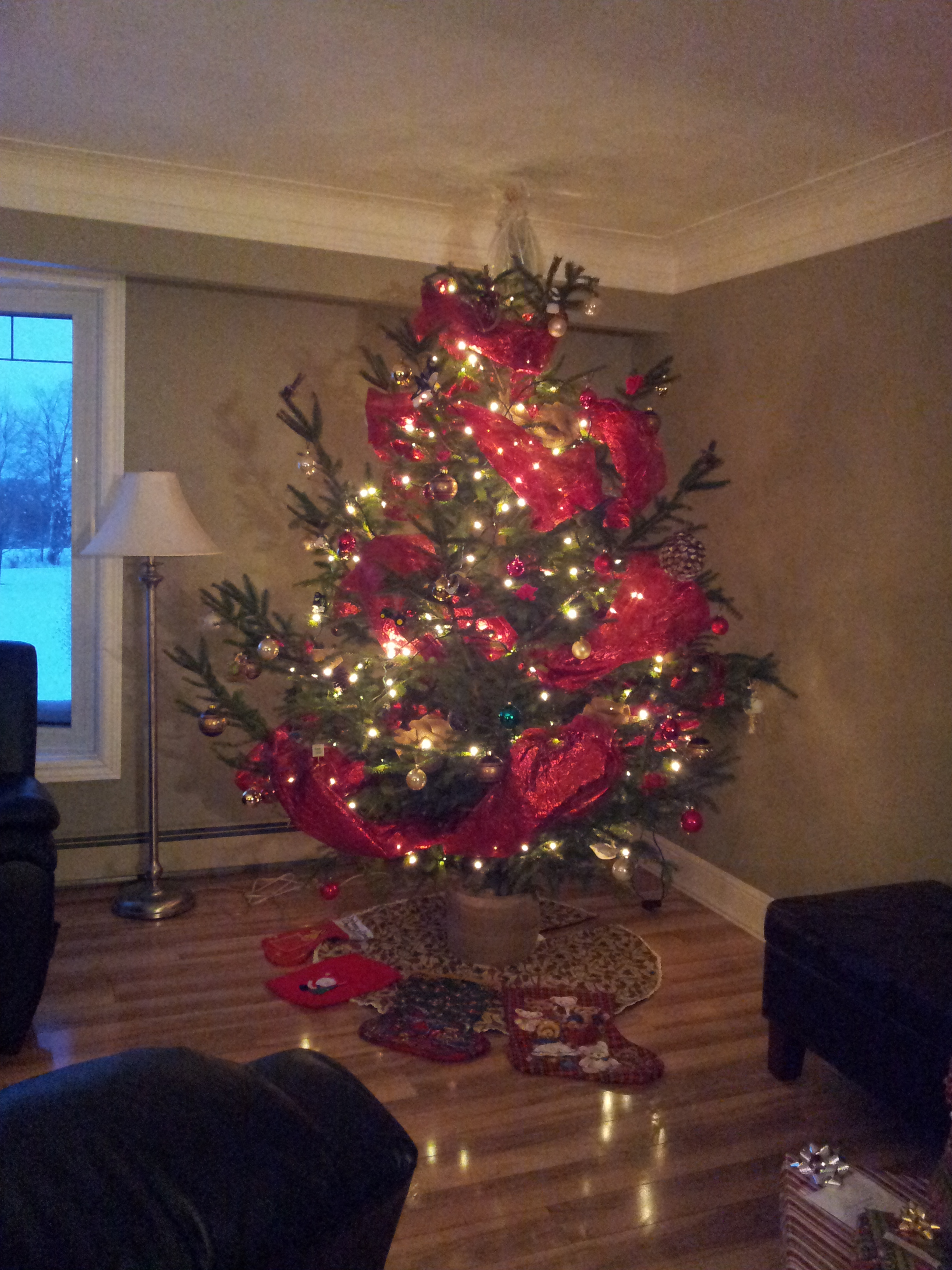 Yes, that’s the tree, upright, outside the house. Adjacent to the sliding glass doors. No photoshopping here, Jack. That tree is THAT TALL. Hmmmm. Wisely, The Big Guy decided to wait until I was at work to bring the tree in the house. We knew the tree would need a little trimming. The top was very spindly, so we figured nipping that off would solve the problem. What I missed was A LOT of trimming. A LOT of sap and, my favourite, a middle of the kitchen stump docking. Yes, A SAW IN MY KITCHEN.