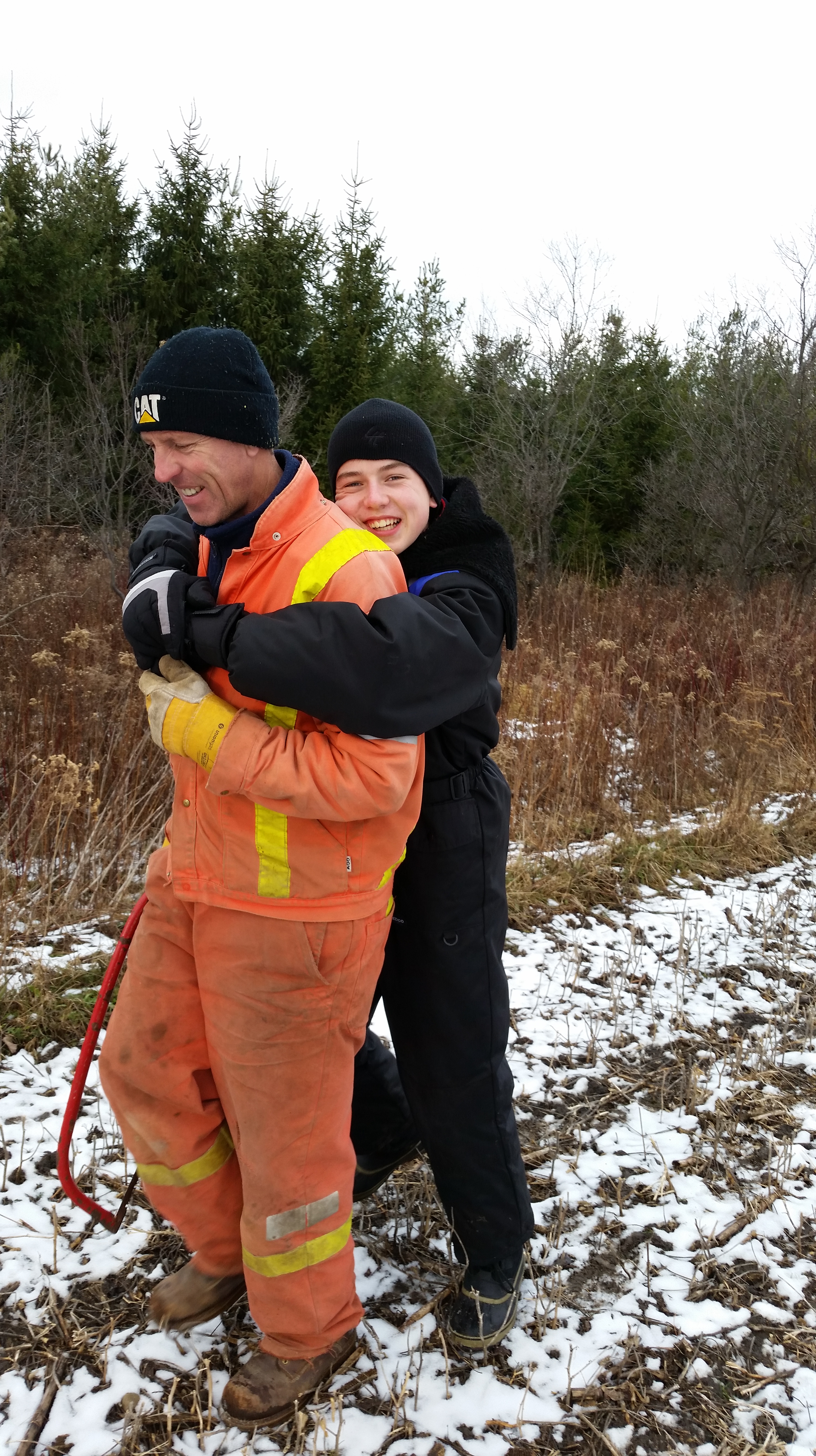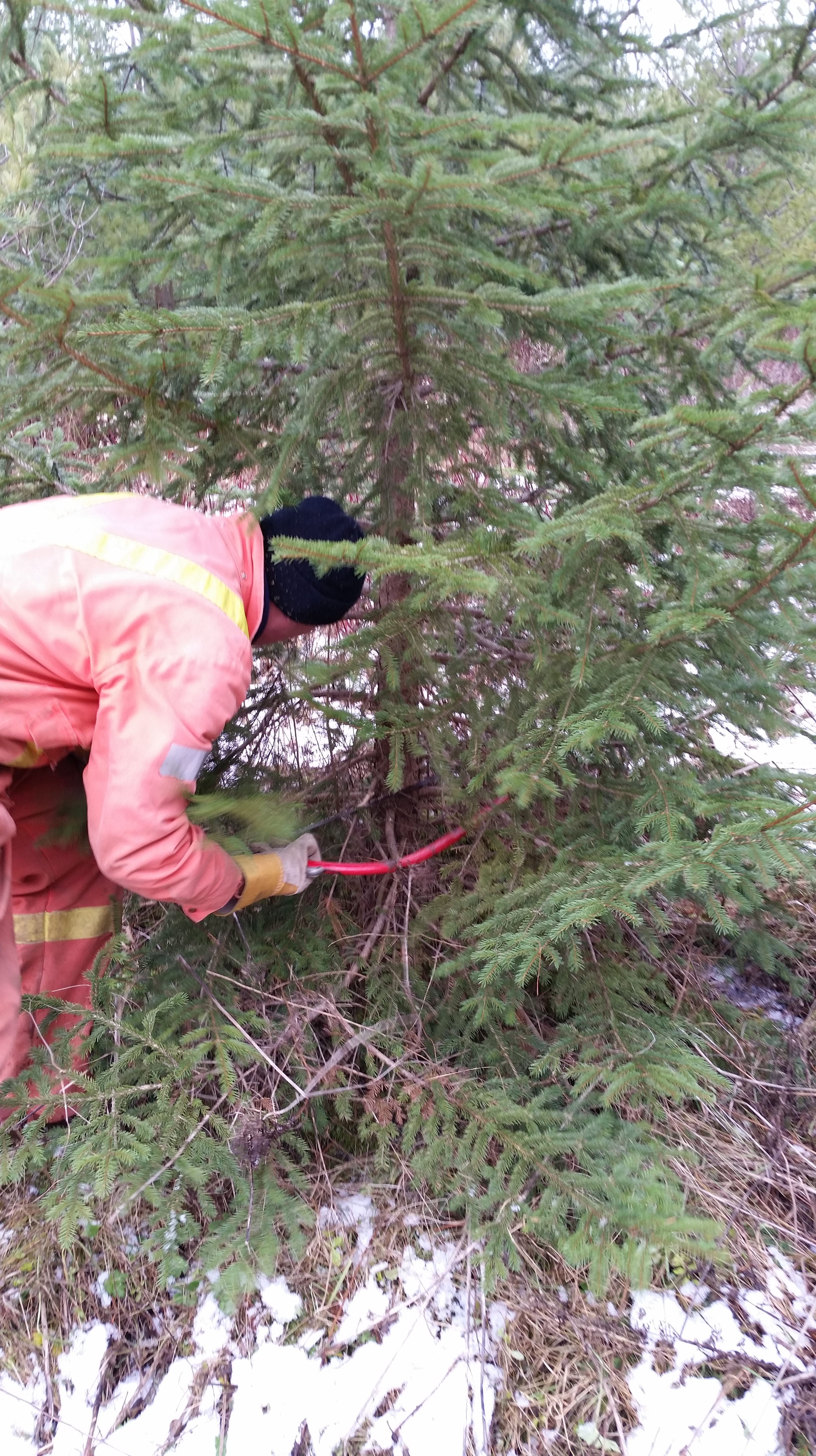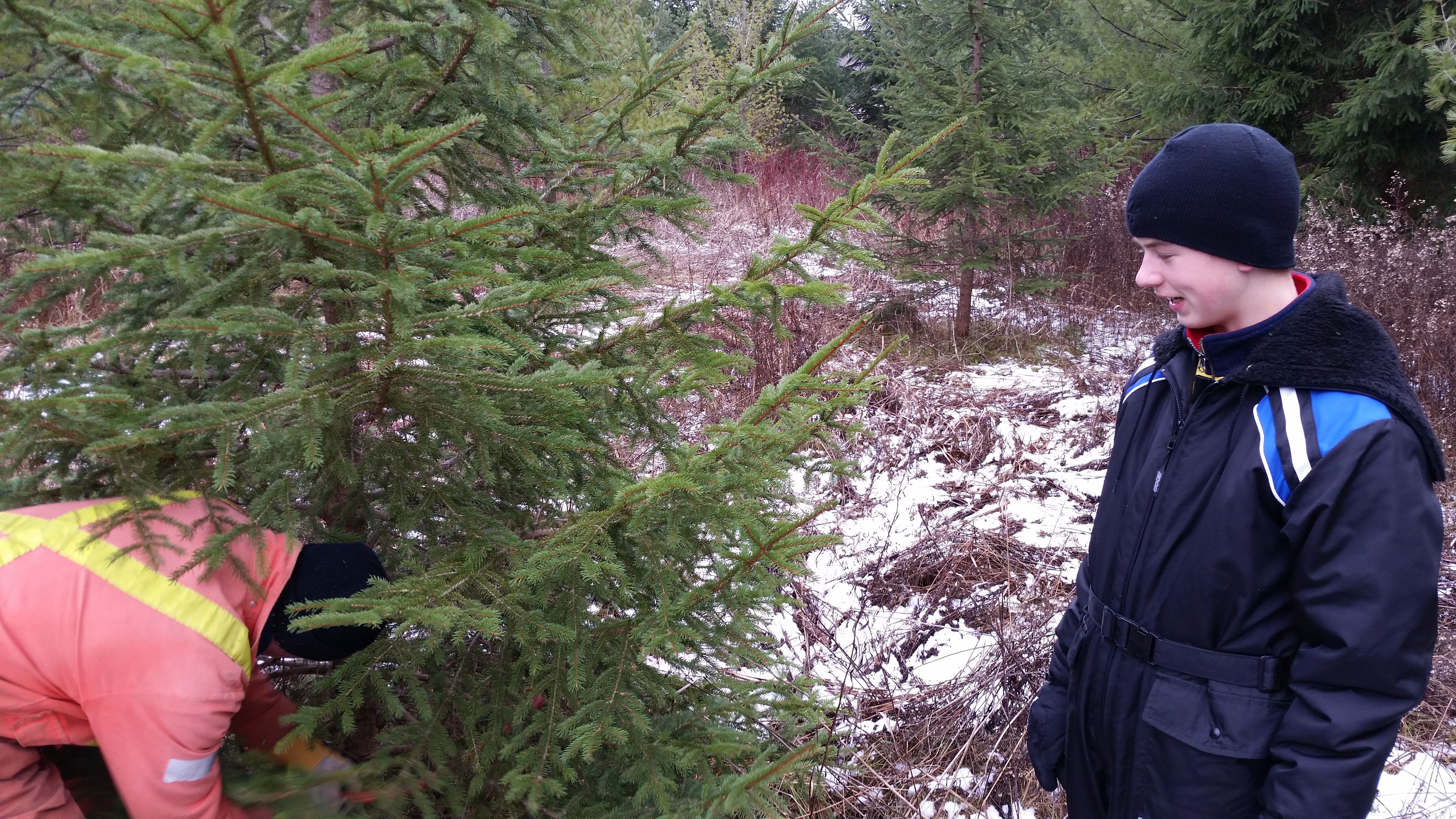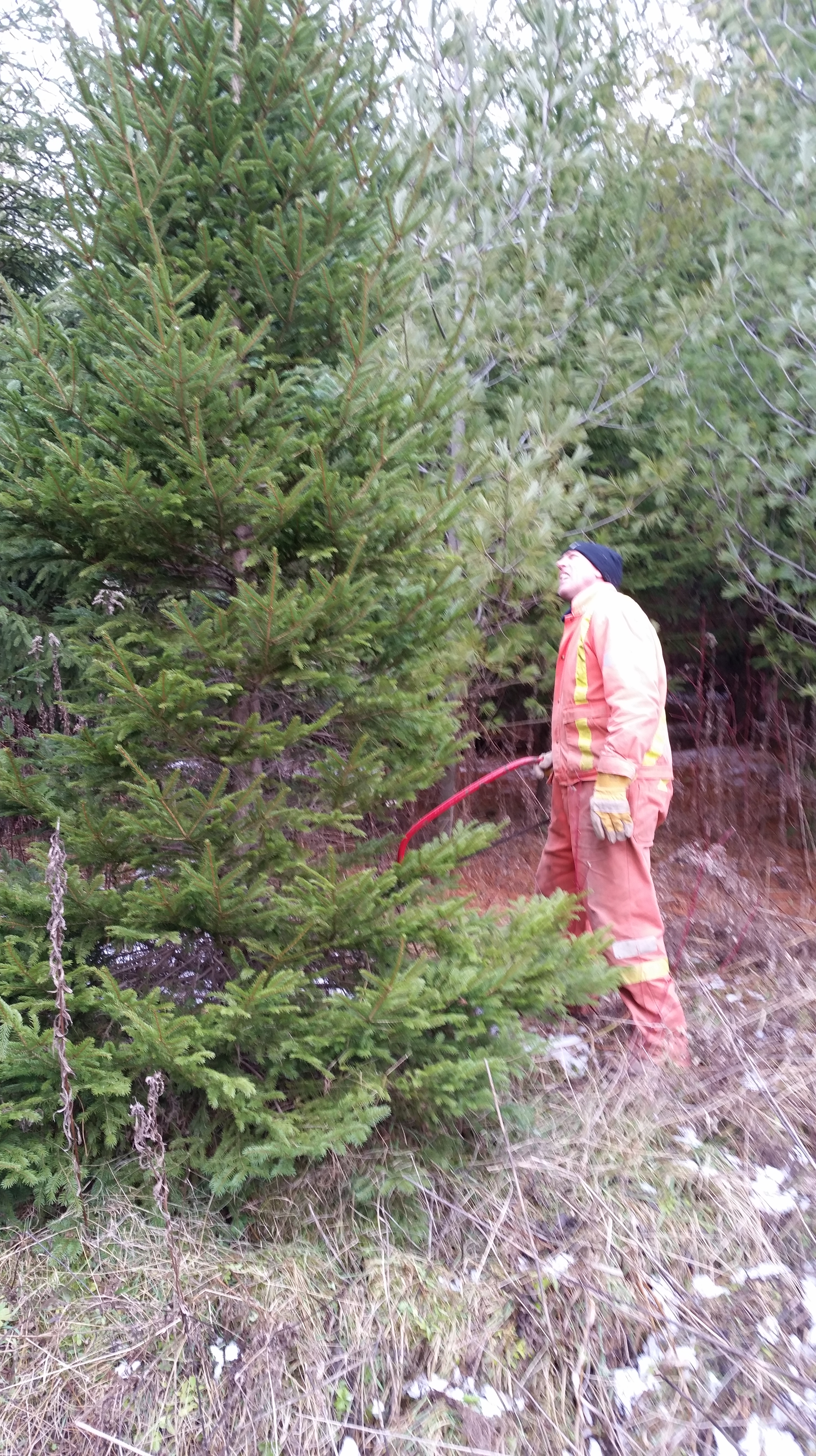 Finally the confusion was clarified, and we decided we had our tree, thanks to SBS. Now, it was time to cut that bad boy down and haul it back. SBS was a little slow to volunteer, after what had happened to him last year, but his father convinced him that would never happen TWICE! SBS stood his ground, so it was The Big Guy who had to cut the tree.